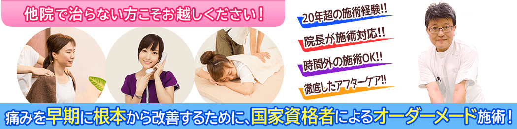 早期に必要な対応をしっかりとさせていただき、少しでも早く痛みが改善するように施術させていただきますので、ぜひご相談ください。